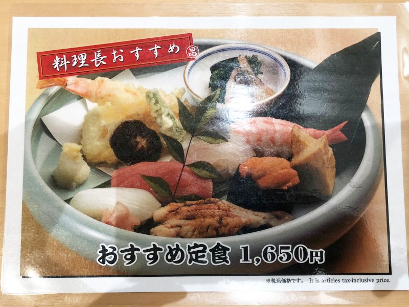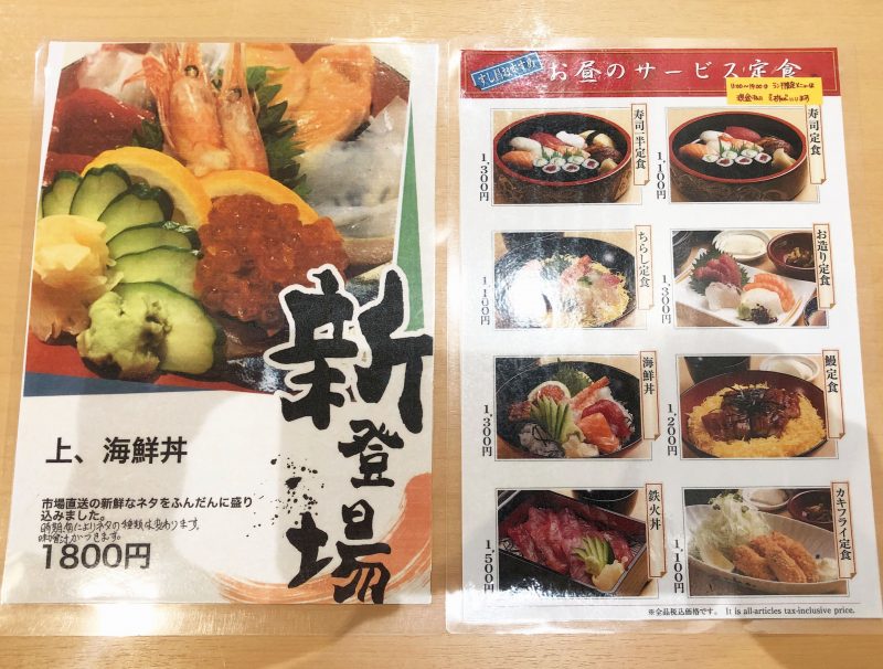11時〜14時はお得な「お昼のサービス定食」も用意されています。寿司居酒屋的な利用もOKで飲む人にとっても便利ですね。「お昼のサービス定食」はおおむね¥1,000チョイで注文できるリーズナブルな価格設定。今回は和食・海鮮の新年初REPORTということで、ちょっと奮発して「上、海鮮丼」¥1,800を注文してみました。