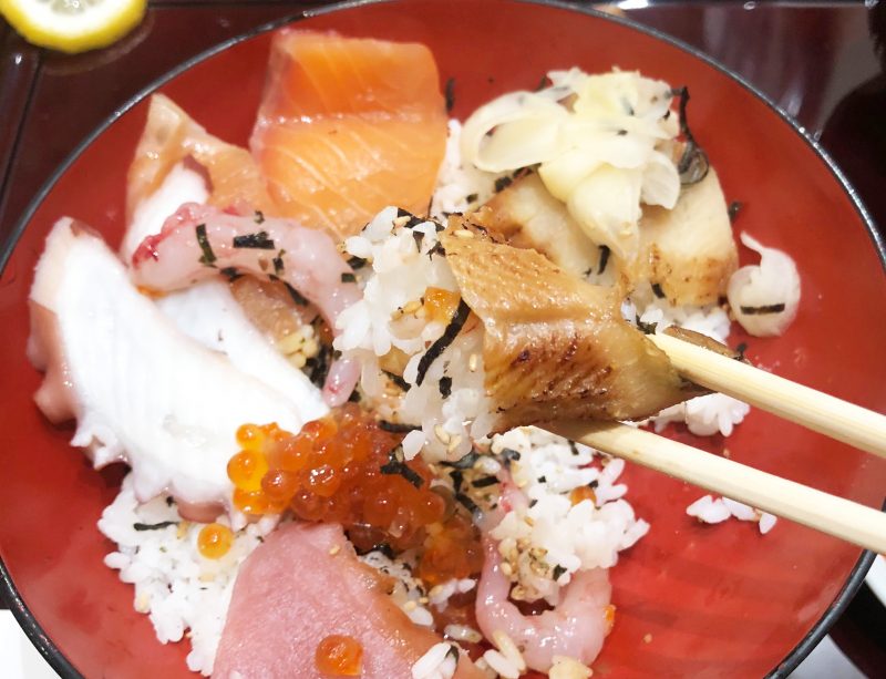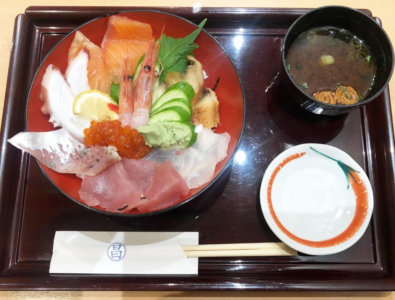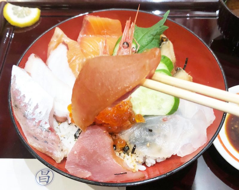 「上、海鮮丼」が到着。“市場直送の新鮮なネタをふんだんに盛り込みました”と書かれているだけあって、どのネタも新鮮そうな色合いです。マグロ、タイ、煮穴子、サーモン、タコ、ハマチ、甘エビ、イクラが乗った豪華な布陣で、¥1,800とは思えないコスパ的にも優れた海鮮丼でしょう。