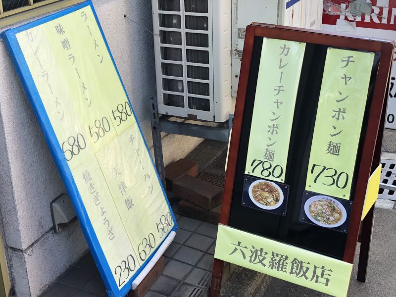 松原通川端通の交差点を東へ370mほど行ったところにある町中華店「六波羅飯店(ろくはらはんてん)」。少なくとも40年以上に渡って営業されている、この近辺では有名な大衆中華料理店です。テレビ番組の街ブラロケなどでもチョイチョイ紹介されているものの、祇園宮川町といった京都有数の歓楽街に近いため有名飲食店も数多く、意外と穴場な名店と言えるでしょう。本当は冷やし中華の時期に訪問しようとこれまで温存していたお店でした。ただ、用事で近くまで来てお店の外観を見た瞬間、ムショーに食べたくなってしまい夏まで待てそうにありませんので、今回REPORTいたします。時刻は13:40、まずは店頭のメニューをご覧ください。