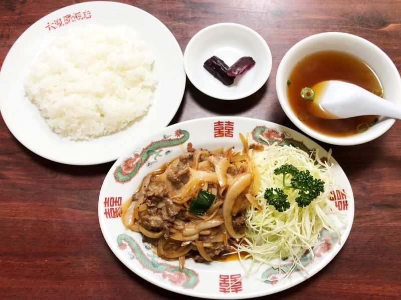 特殊な料理はないものの、町中華の基本メニューはしっかりと抑えられています。今回は管理人が大好きな「ジンギスカン定食」¥720と、こちらでは必食の「鍋貼餃子(焼きぎょうざ)」¥230を注文してみました。