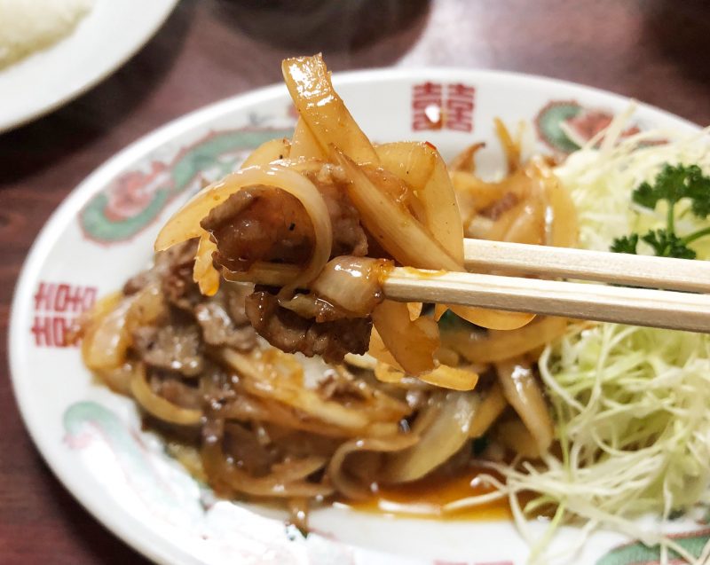 「ジンギスカン定食」、そしてしばらくして「鍋貼餃子(焼きぎょうざ)」が到着。ジンギスカンはマトンとタマネギたっぷりで昭和の中華店らしさ全開のスタイルです。焼き餃子は中サイズ6個と平均的なボリュームながら、このカリッと焼かれた小麦色のビジュアルが食欲をそそります。この餃子が¥230というオヤツ感覚の価格でいただけるのも素晴らしく、まさにサイドメニューの王道です。早速「ジンギスカン定食」からいただきましょう。