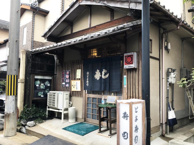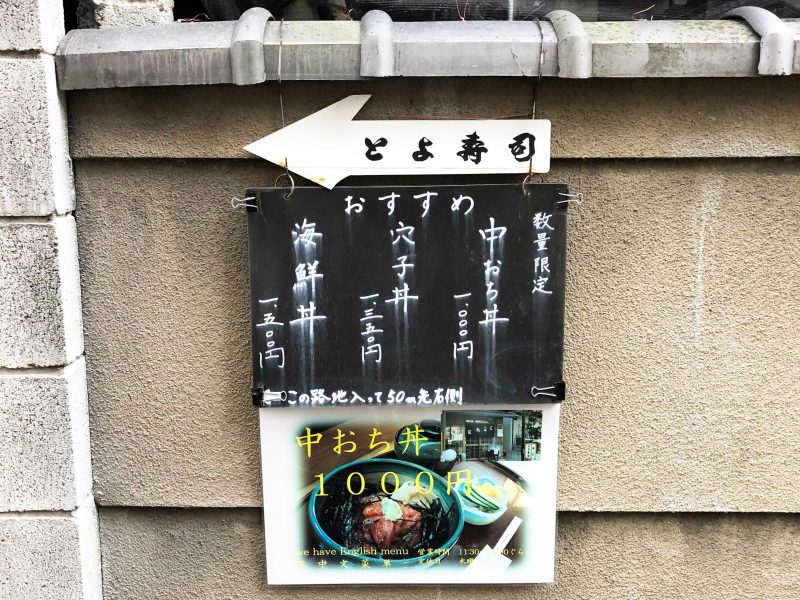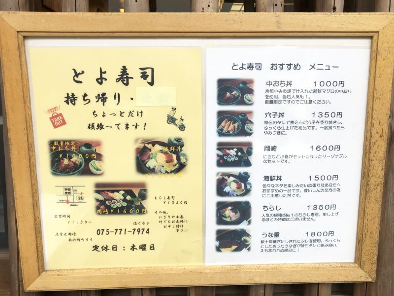 年季の入った外観がおもむきを感じさせる「とよ寿司」に到着。こちらも古くからの寿司店で、知る人ぞ知る街の名店といったところでしょうか。「平安神宮」の観光客だけでなく、地元の人にも人気のお店として知られ、京都市内の寿司好きも足繁く通う穴場です。こちらは11:30から営業されていて、お昼の営業終了時刻は特に決まっていません。お店の大将にお話を伺ったところ、このあたりは自営業の人が多い立地なこともあり、かなり遅めの昼食を取られるお客さんも多いため、お店自体は閉めていないとのこと。あくまで管理人の感覚ですが、15時ぐらいまでなら安心して食事ができると思います。時刻は13:50、店頭のメニューを確認してみましょう。