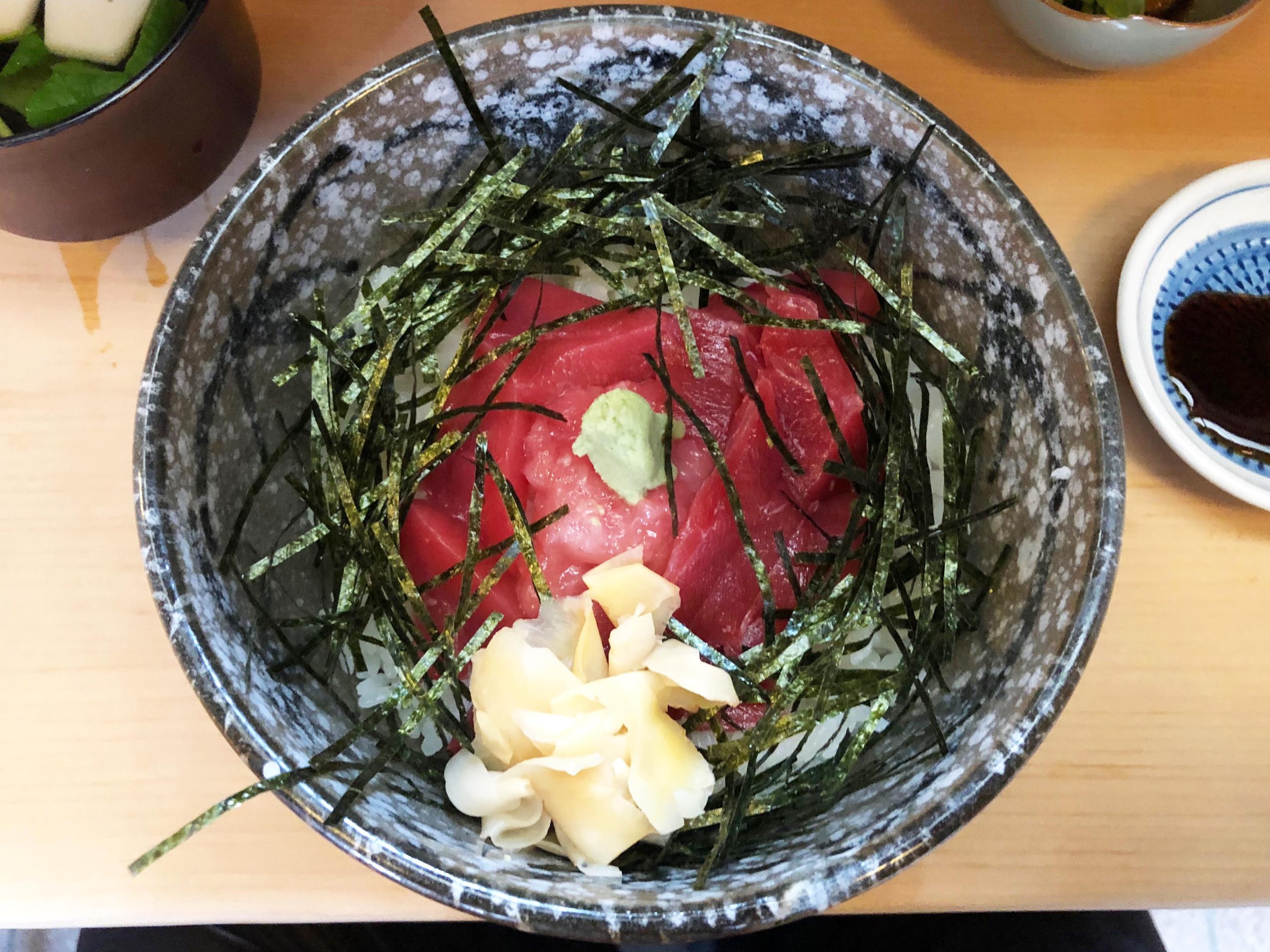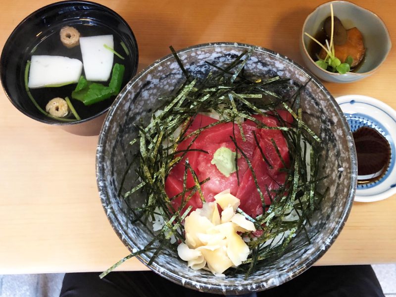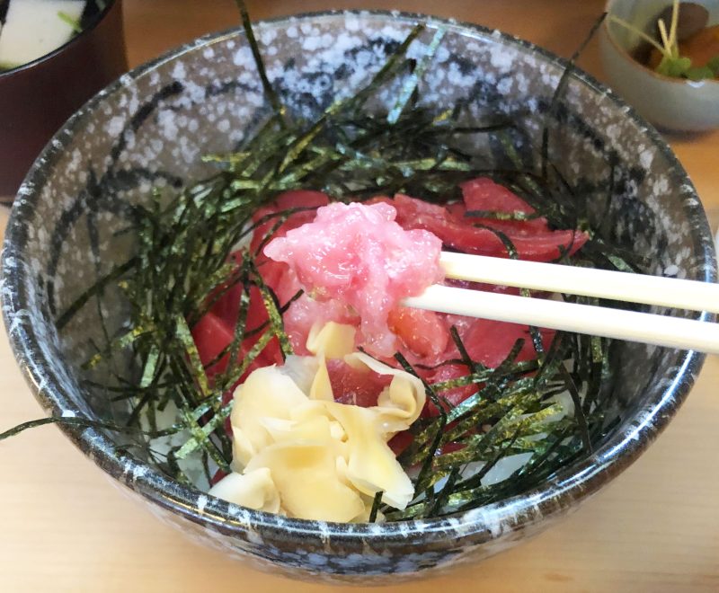 「中おち丼」が運ばれてきました。鮮やかなマグロ丼に吸い物、タイのあら炊き風の小鉢といった豪華な陣容です。マグロは中心部分に脂の乗った中落ち、その外周を赤身が配されています。ご飯は酢飯でガリも寿司店らしいおいしさ。ではわさび醤油を作成し、マグロにかけ回していただきましょう。