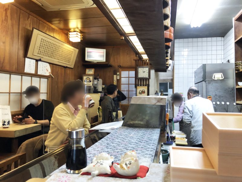 セットメニューであれば¥2,000を超えるものはなく、「ちらし」¥1,350や「海鮮丼」¥1,500なども人気です。ちょっと贅沢なランチにはピッタリな価格設定となっていて、ミドルやシニアのお客さんが多い感じとなっています。もちろん本格的な寿司店ですので、お昼からお好みで握り寿司などを楽しむことも可能。管理人のような貧乏人にとって“お好みで握り寿司”と書くだけで震えが止まりませんが、だいたいのお客さんはお昼はセットメニューですので安心です。そしてこちらの一番人気は何と言っても「中おち丼」¥1,000です。数量限定ではあるものの、新鮮なマグロをたっぷりと堪能できる逸品。しかも¥1,000と超お値打ち!遅い時刻の訪問となってしまったため、「中おち丼」にはありつけないかも…と不安を抱きつつ、早速店内へ入ってみました。