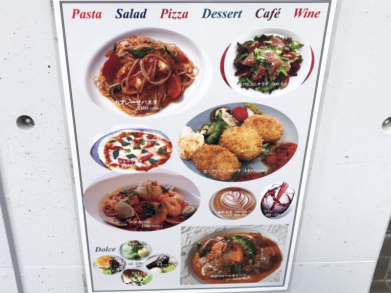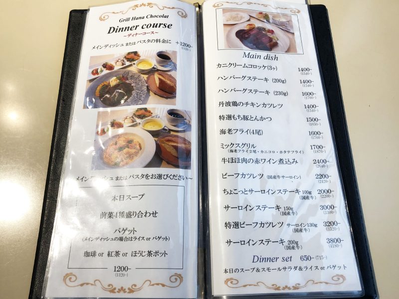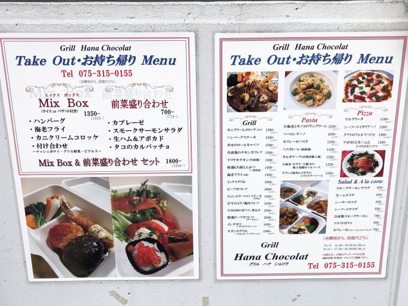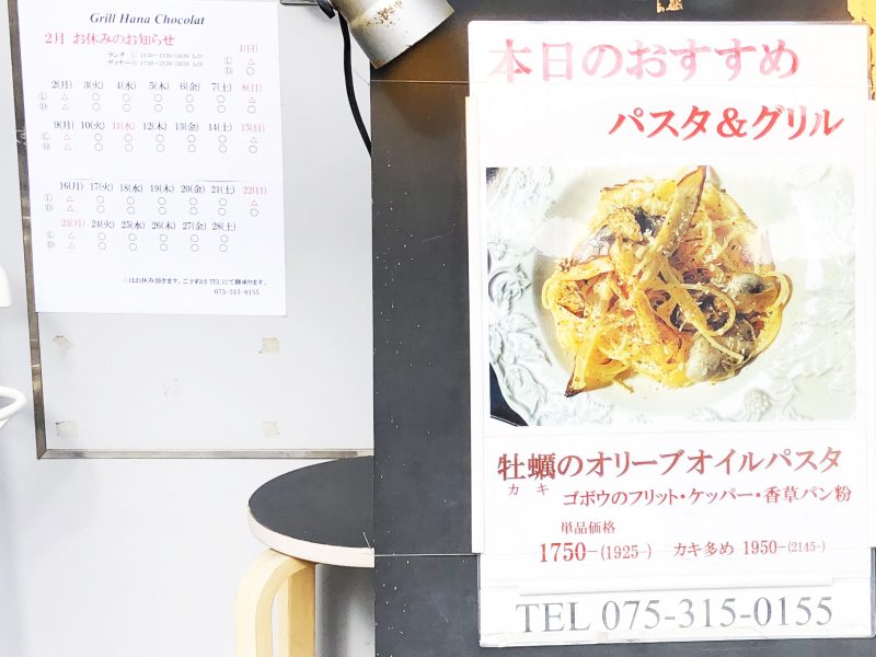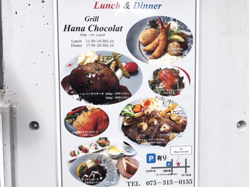 西大路通と五条通の交差点(西大路五条)を南へ400mほど行き、花屋町通の交差点(西大路花屋町)を西へ50mほど行ったところにあるレストラン「Grill Hana Chocolat(グリル ハナ ショコラ)」。チョコレート屋さんと勘違い?しそうな店名ですね。お店の名前は京都市在住時代から知っていていずれ訪問する予定の1軒でした。JR西大路駅から徒歩15分程度と少し距離はあるものの京都市バス「西大路花屋町」バス停から徒歩1分とかなり近いため、公共交通機関の利用でも不便ではありません。また、ランチタイムは1台、ディナータイムは2台停められる駐車場が店頭から西へ25mほど行ったところにあります。停められる台数は少ないですが、近隣にはリーズナブルなコインパーキングが複数ありますので、車で来店される人にも便利なお店でしょう。こちらの昼の営業時間は11:30〜ラストオーダー14:30、夜は17:30〜ラストオーダー20:30で、少し遅めのランチにも対応。こじんまりとした外観でお一人様でも入りやすい雰囲気です。時刻は13:15、まずは店頭のメニューを確認してみましょう。