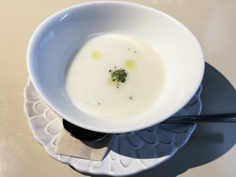 まずは本日のスープである「聖護院かぶらのポタージュ」が到着。ハイ、もうおいしい。食べなくてもおいしいに決まってます。とパクリ。冬のかぶが持つ根菜特有のほのかな甘みがおいしい。泥臭さや青臭さなどは一切ありません。クリーミーなポタージュの優しい味わいが今が旬の聖護院かぶらと良く合っています。聖護院かぶらは京都原産のかぶの一種で、京野菜の代表的な1つ。京都人にとっては千枚漬けやかぶら蒸しなどで馴染み深い野菜です。そしてかぶ自体、世界の多くで食用とされていて、フランス料理でもスープやローストなど頻繁に使用される食材。そんなかぶの中でも高いクオリティの聖護院かぶらとフランスの代表的なスープであるポタージュとの融合は、合わないワケがありません。この一皿でこちらのお店の実力がよくわかりました。