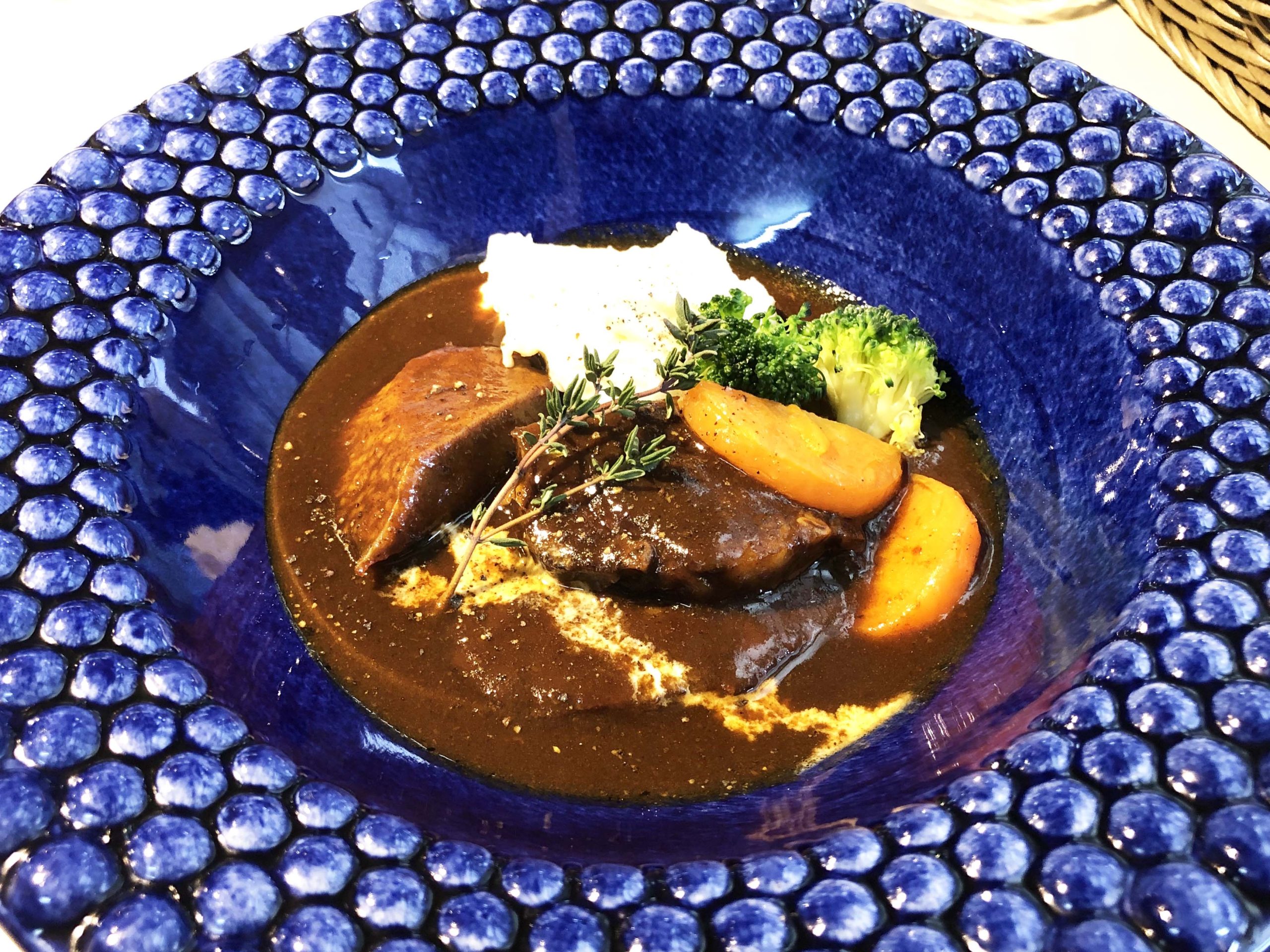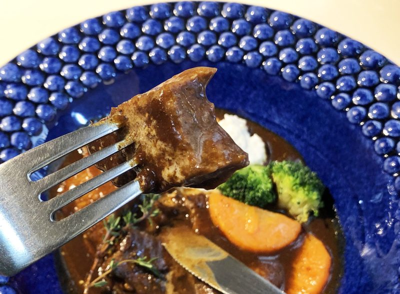 そして「牛タンのシチュー 〜デミグラス・生クリーム〜」です。今回は何となくバケットではなくライスにしてみました。「タンシチュー」のポテンシャルを最大限に発揮されるのは実はパン。最後にお皿に残ったソースをパンで拭き取れるからなのですが、昭和からの洋食好きとしてはライスに合う「タンシチュー」や「ビーフシチュー」こそ本物であり王道なのです。「タンシチュー」や「ビーフシチュー」の源流は西洋料理、おそらくフランス料理の赤ワイン煮込みが日本で独自に発展したものだと思いますので、ご飯に合って当然でしょう。ただし、たま〜に見かける味噌や醤油を隠し味に使う「タンシチュー」や「ビーフシチュー」は、おいしいとは思うものの昭和の洋食店の味ではありません。管理人が特に「タンシチュー」に求めるのは、昭和から受け継がれてきた正統な味。では早速いただきましょう。
