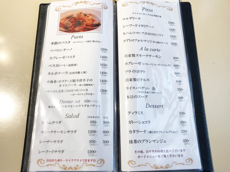 テイクアウトも充実していて、家族や友人とホームパーティーなどをされる人にとっても利用しやすいのではないでしょうか。管理人は家族も友人もいませんのでテイクアウトしても、ひとり自宅でYouTubeを視聴しながらモシャモシャ食べるため台無しです。訪問した日の「本日のおすすめパスタ&グリル」は「牡蠣のオリーブオイルパスタ」¥1,925(カキ多め ¥2,145)で、牡蠣が大好きな管理人にとっても堪りません。もう「牡蠣のオリーブオイルパスタ」で良いのでは?と注文してしまいそうになりました。危なかった。どうにか思いとどまったものの、これがもし「カキフライ」であれば、「タンシチュー」を裏切っていたかも知れません。こうして裏切りに次ぐ裏切り、憎しみの連鎖が進み、最終的には世界大戦、そして地球滅亡という破滅へ至るのでしょう。管理人が思いとどまったことで裏切りのない平穏な日が続いていくのです。またこの世界を救ってしまいました。なぜか真の救世主となってしまったところで、店内へ入ってみましょう。